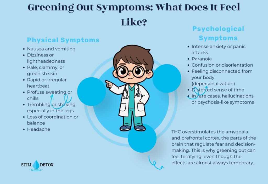 - Greening out is a THC overconsumption reaction causing symptoms like nausea, dizziness, rapid heart rate, panic, and vomiting.